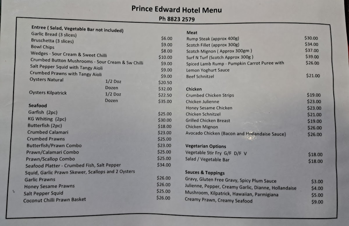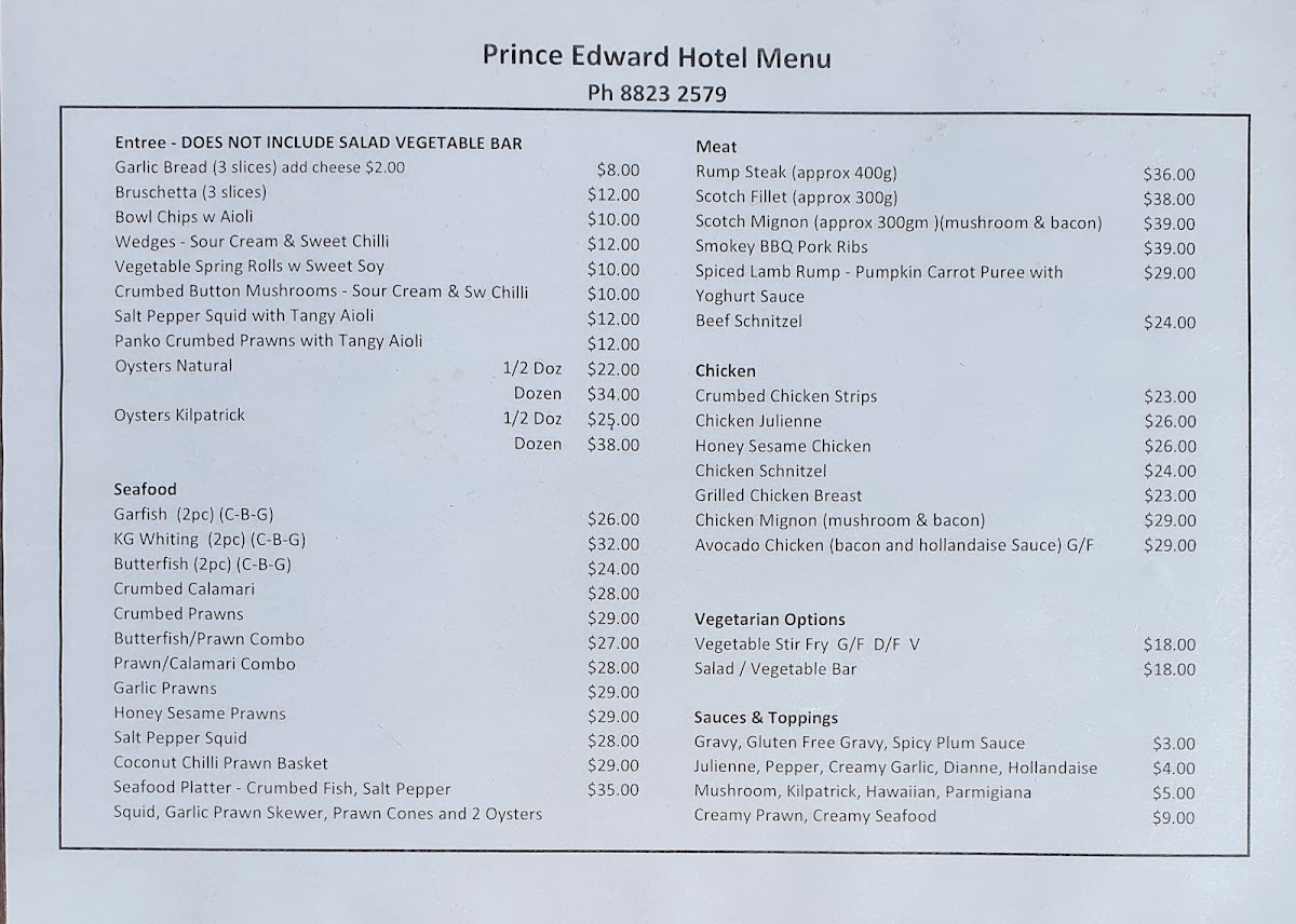 The menu at Prince Edward Hotel offers a relaxed, approachable dining experience that suits a variety of occasions—from casual lunches to family dinners and weekend gatherings with friends. The style is straightforward and comforting, featuring classic pub fare with a focus on hearty and familiar flavours.